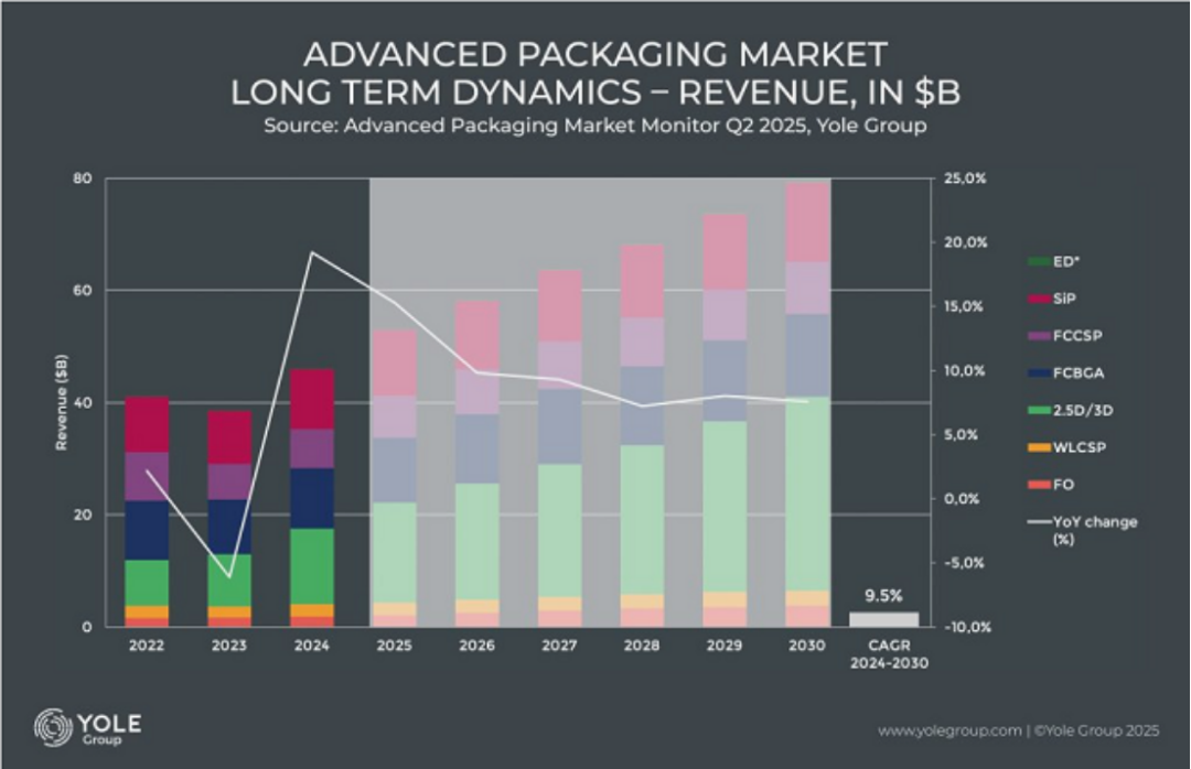 随着人工智能技术快速发展,先进封装已超越制程工艺成为半导体行业最热门领域。Yole 集团数据显示,全球先进封装市场到 2030 年达到约 800 亿美元,将以 9.4% 的年复合增长率持续增长。