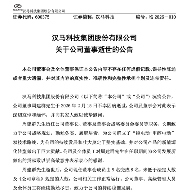 快科技2月25日消息,昨晚,汉马科技公告称,公司董事周建群于2月15日不幸因病逝世,公司及董事会对此表示深切哀悼和缅怀,并向其家人致以诚挚慰问。
