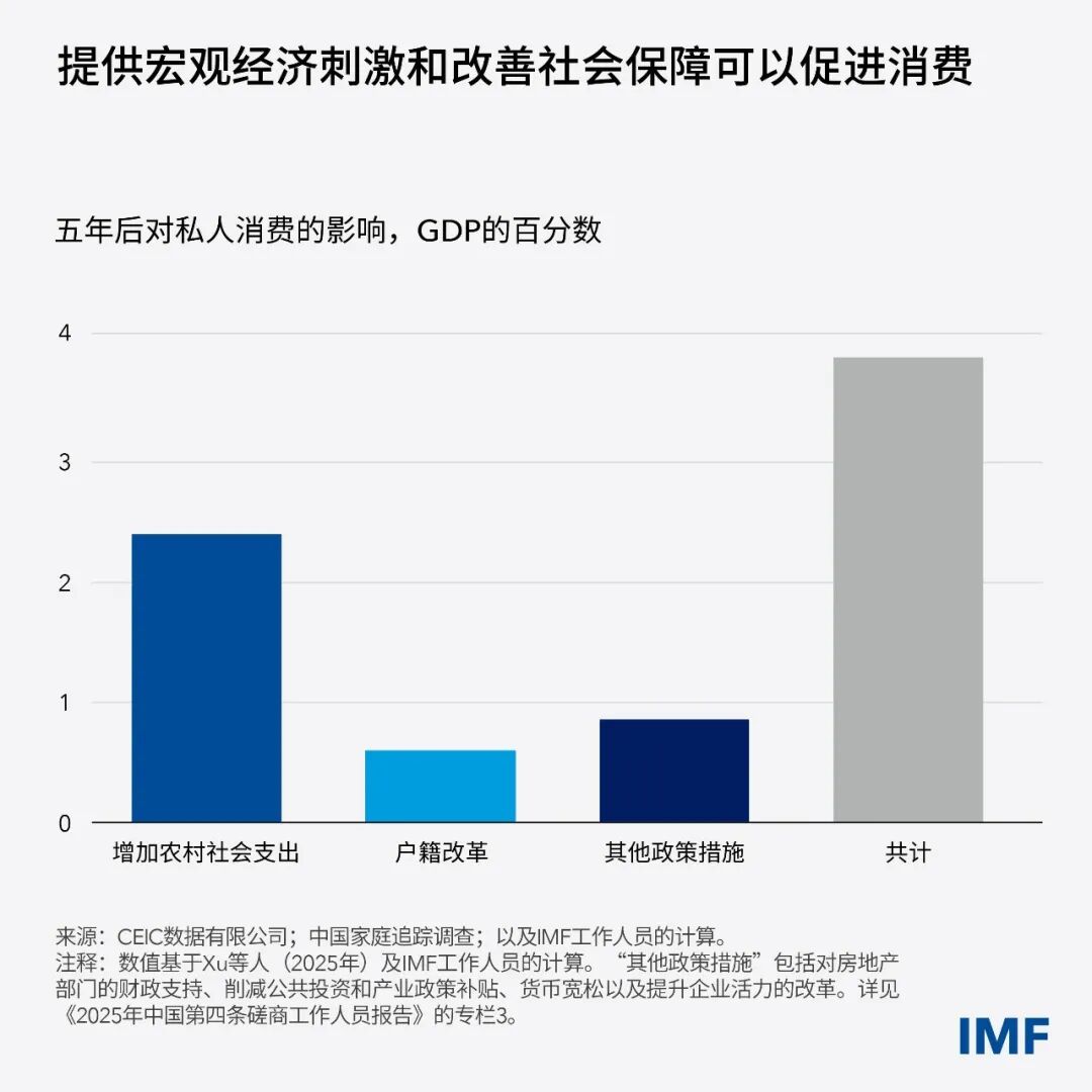 综合来看,IMF的政策建议将显著推动中国向消费拉动型经济的再平衡,可使消费占GDP的比重在五年内提高约4个百分点。释放庞大国内市场的潜力将降低经济增长对外部需求的依赖,从而使其更具韧性。