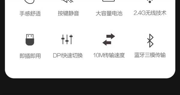 支持电量显示、静音微动、长久续航;即插即用,DPI快速切换,10M传输速度,蓝牙三模传输。