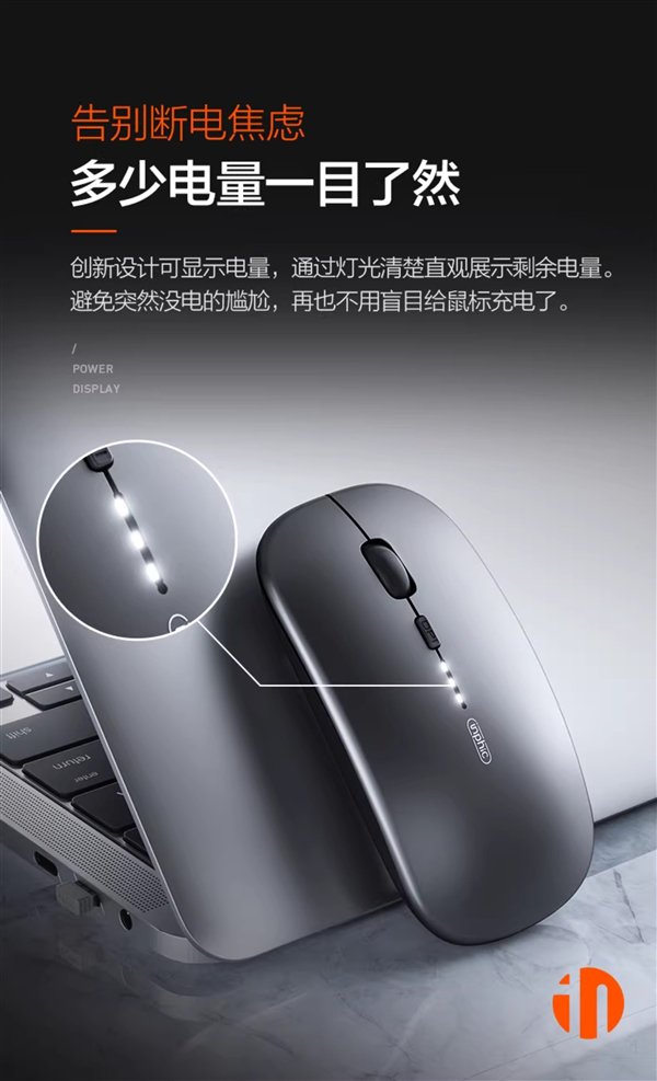 创新设计可显示电量,通过灯光清楚直观展示剩余电量。避免突然没电的尴尬,再也不用盲目给鼠标充电了。