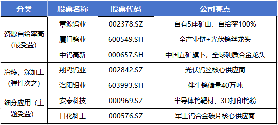 钨价持续上行,对产业链上下游多个环节的上市公司形成显著利好,尤其在高端制造、新能源和光伏等需求爆发的背景下,资源自给率高、产业链布局完善的企业有望充分受益。