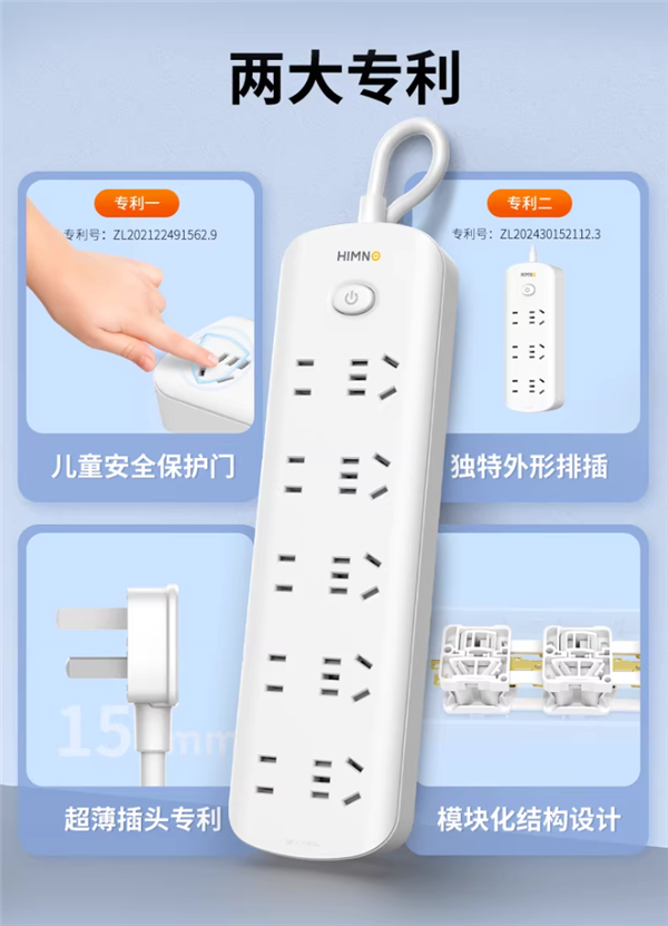 超薄插头专利|独特外形排插|儿童安全保护门|模块化结构设计。