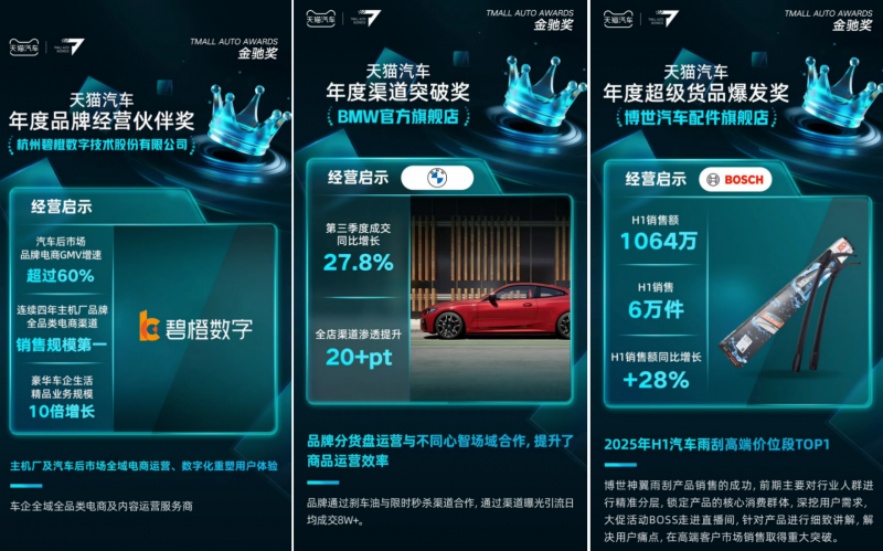 天猫金驰奖作为天猫平台首个汽车行业经营大奖,旨在嘉奖为行业带来突出贡献的品牌与伙伴。碧橙数字能够同时获得三项大奖,源于其可验证的业务成果。在服务汽车后市场品牌时,碧橙数字助力其电商GMV增速超过60%。在主机厂品牌合作中,碧橙数字更实现了连续四年全品类电商渠道销售规模第一的佳绩。以BMW官方旗舰店为例,在其服务下,第三季度成交额同比增长达到27.8%。这些实实在在的增长数据,是碧橙数字荣获金驰奖的最佳注脚。