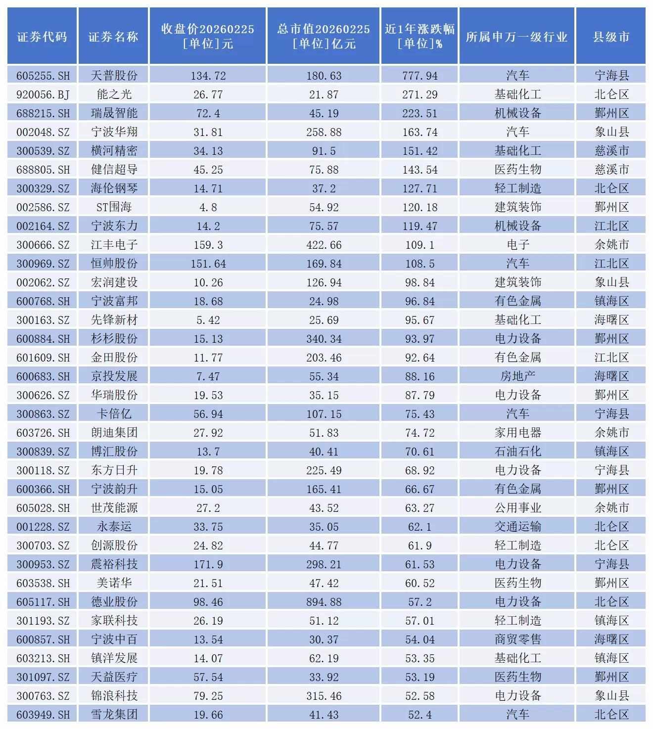 同花顺数据显示,截至2月25日收盘,宁波一共有125家上市公司。从二级市场表现看,近一年,一共有97家公司股价出现上涨。