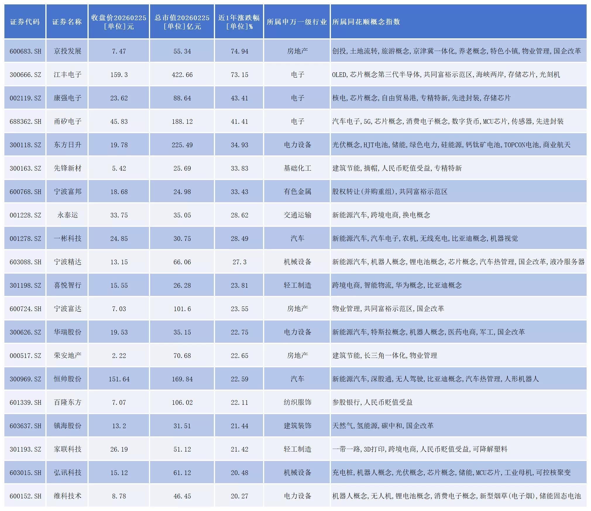 从2026年以来表现看,京投发展(600683.SH)、江丰电子(300666.SZ)、康强电子(002119.SZ)、甬矽电子(688362.SH)、东方日升(300118.SZ)、宁波精达(603088.SH)、喜悦智行(301198.SZ)等20家公司涨幅超过20%。