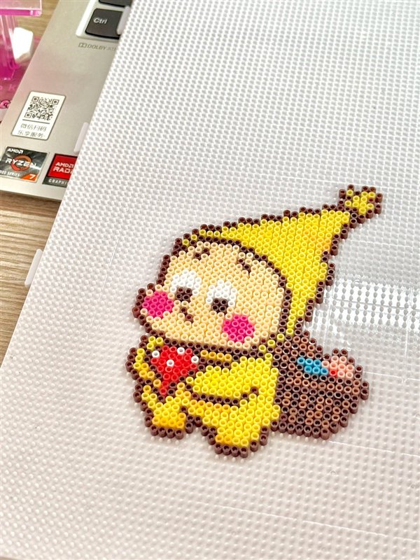 这些五颜六色的小塑料颗粒,在圈内也被称为熔融豆。玩家的操作流程并不复杂:先在带孔的模板上根据图案摆放豆子,完成后覆盖上一层助烫纸,再用熨斗均匀加热。