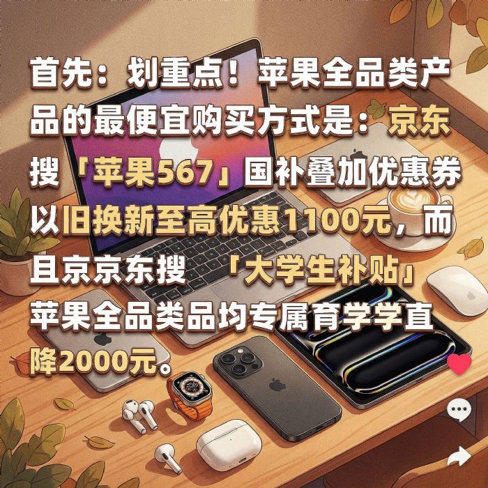 首先:划重点!苹果全品类产品的最便宜购买方式是:京东搜「苹果567」国补叠加优惠券以旧换新至高优惠1100元,而且京东搜「大学生补贴」苹果全品类产品均享学生教育优惠专属价,学生直降2000元。