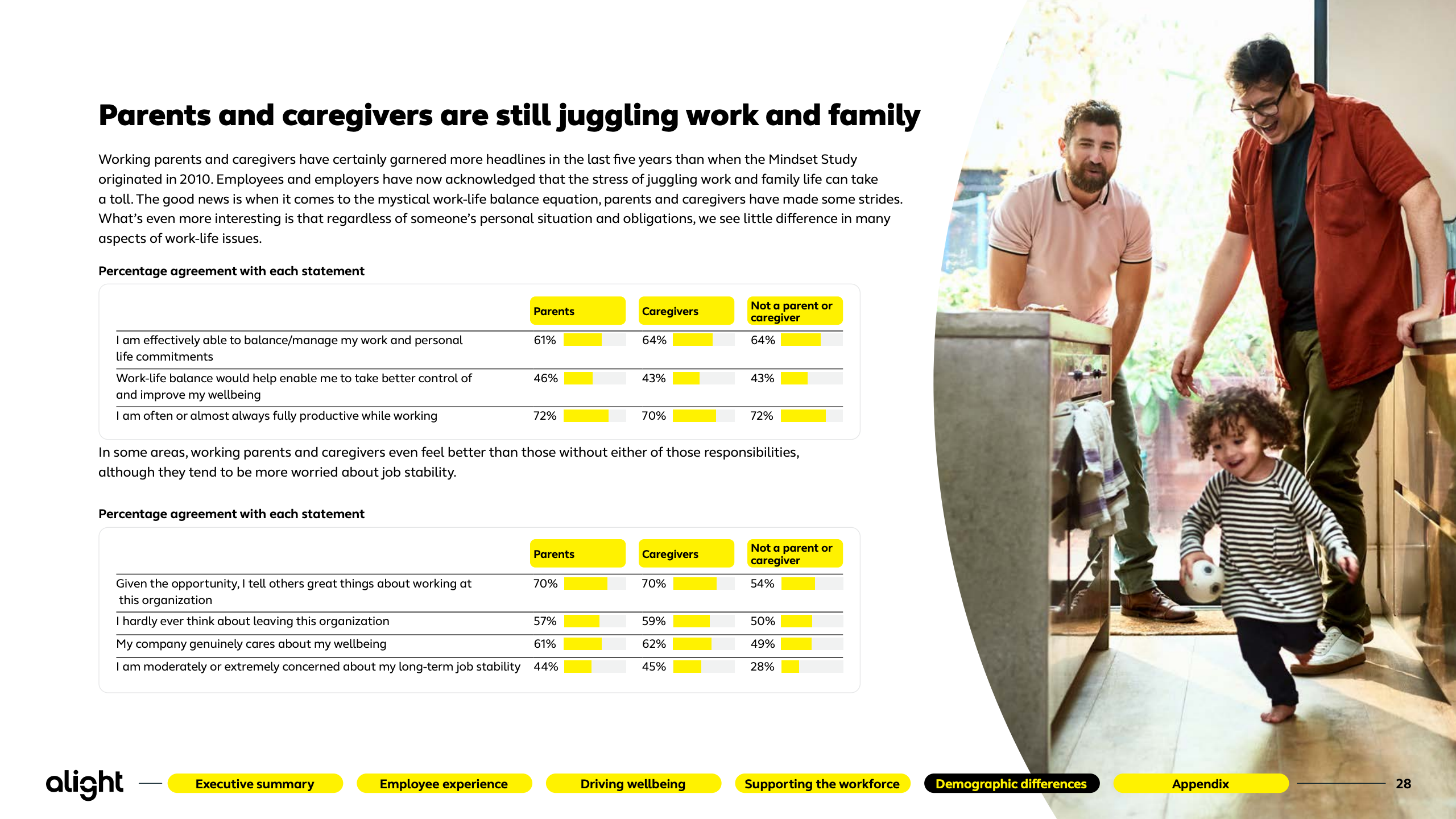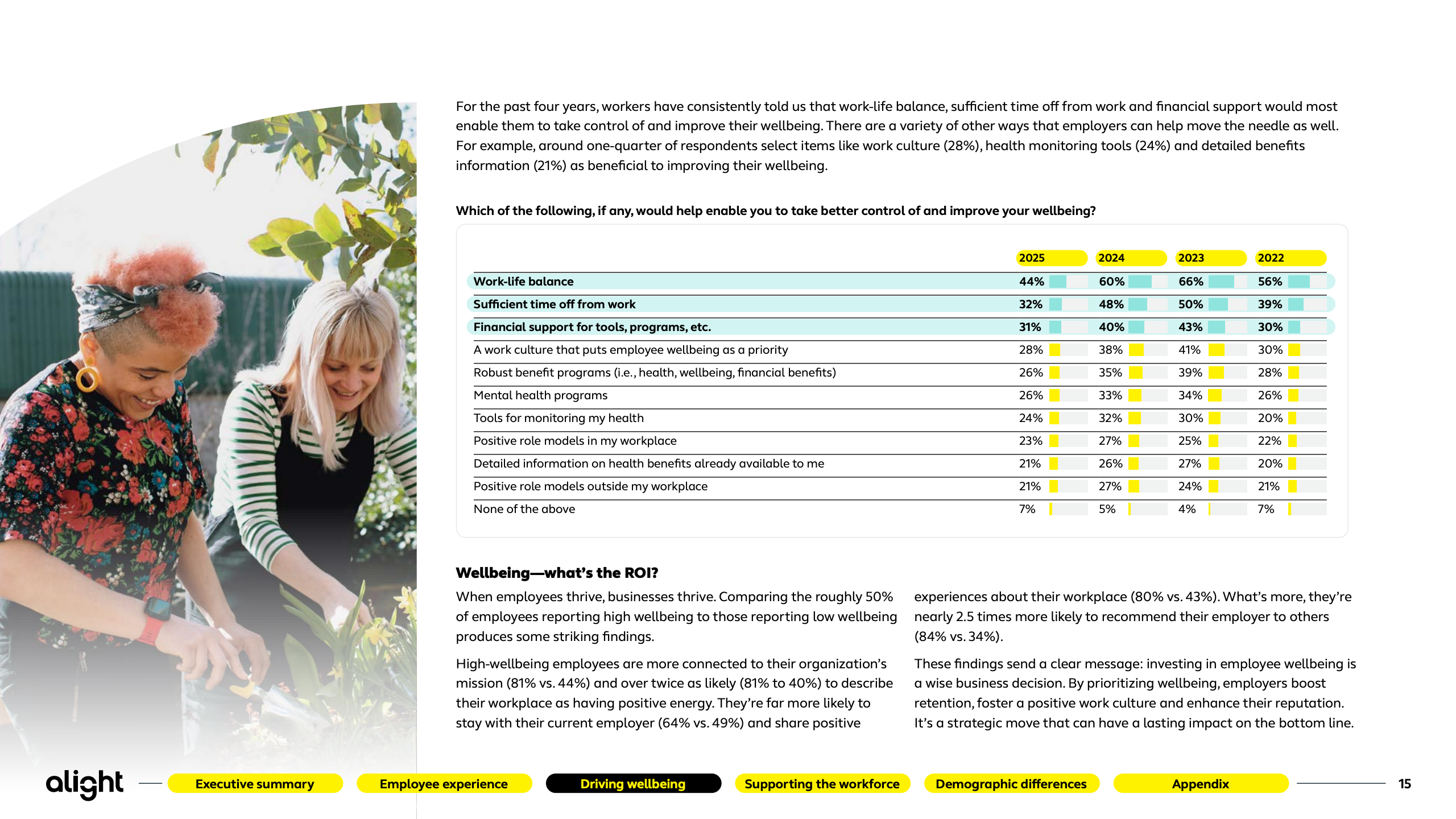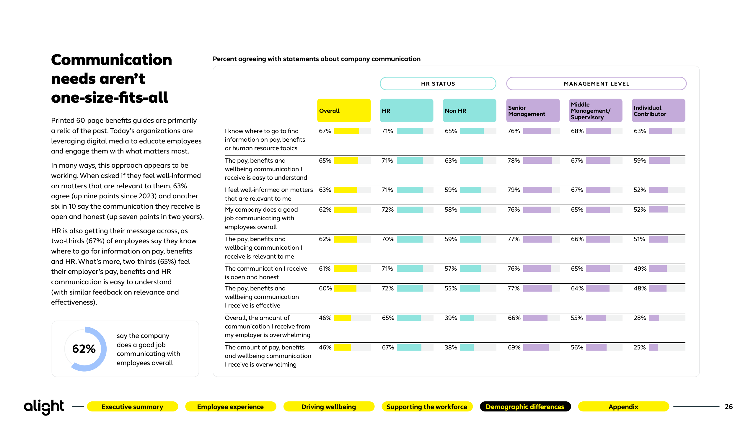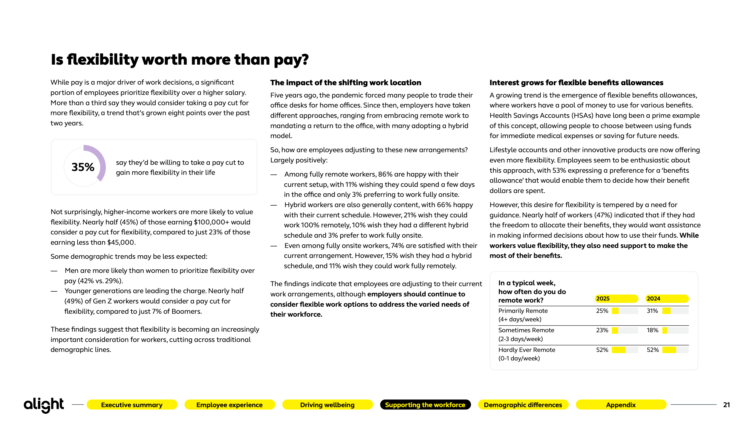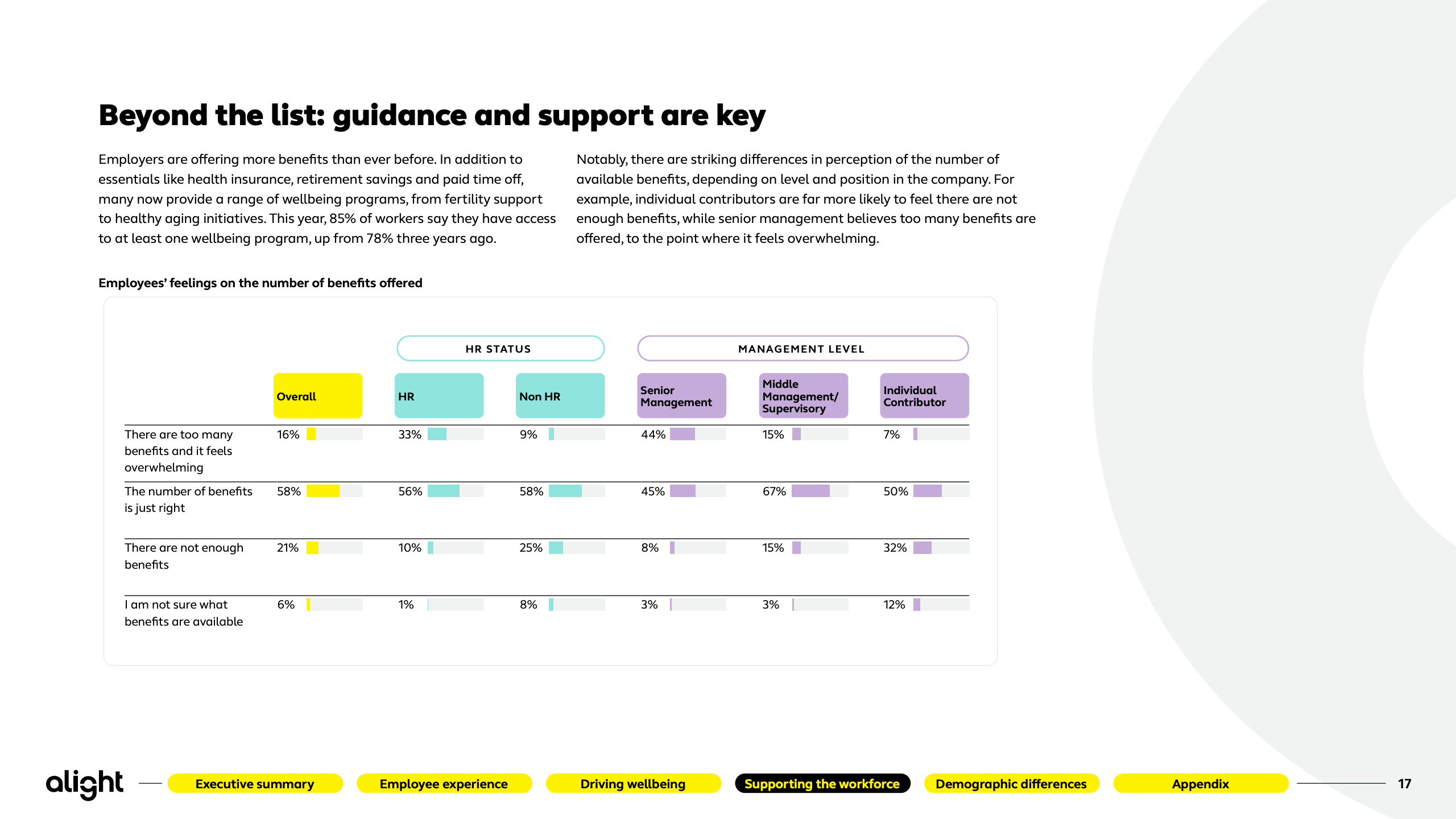 员工福祉出现周期性反弹,但金融压力依旧是核心短板。仅47%的员工对整体福祉感到满意,财务福祉更低至42%。基层员工中,仅27%认为自身财务状况良好。高福祉员工在留任意愿、推荐意愿和生产率上显著领先,83%自评“几乎始终高效”,凸显福祉投入的可量化回报。