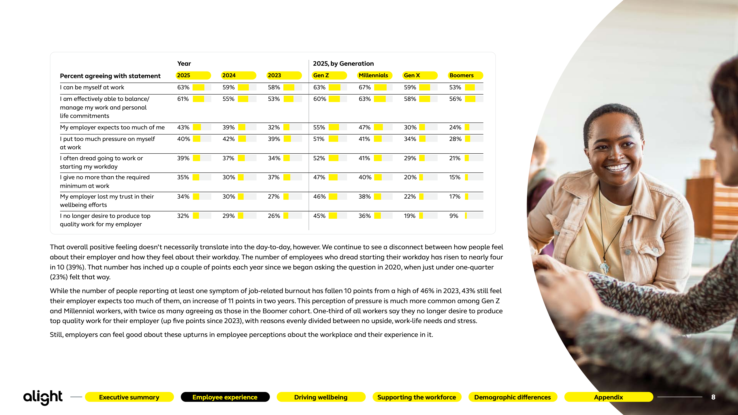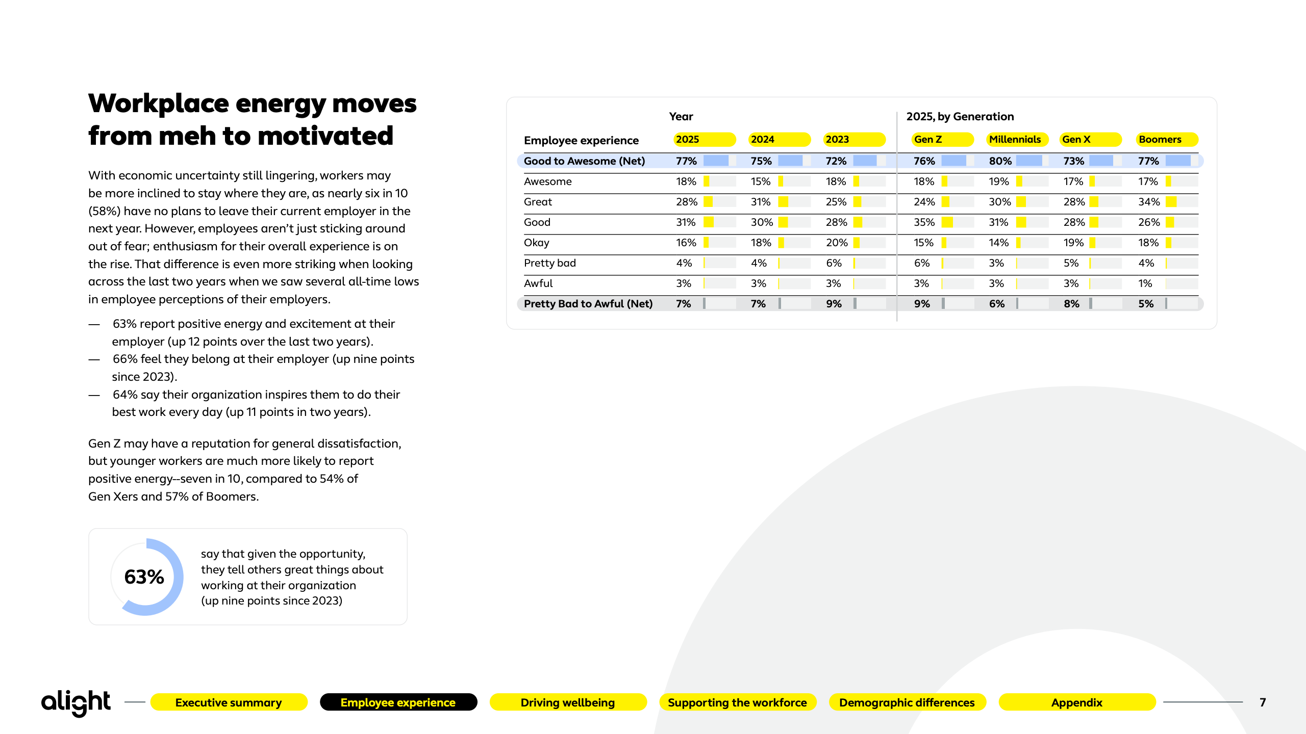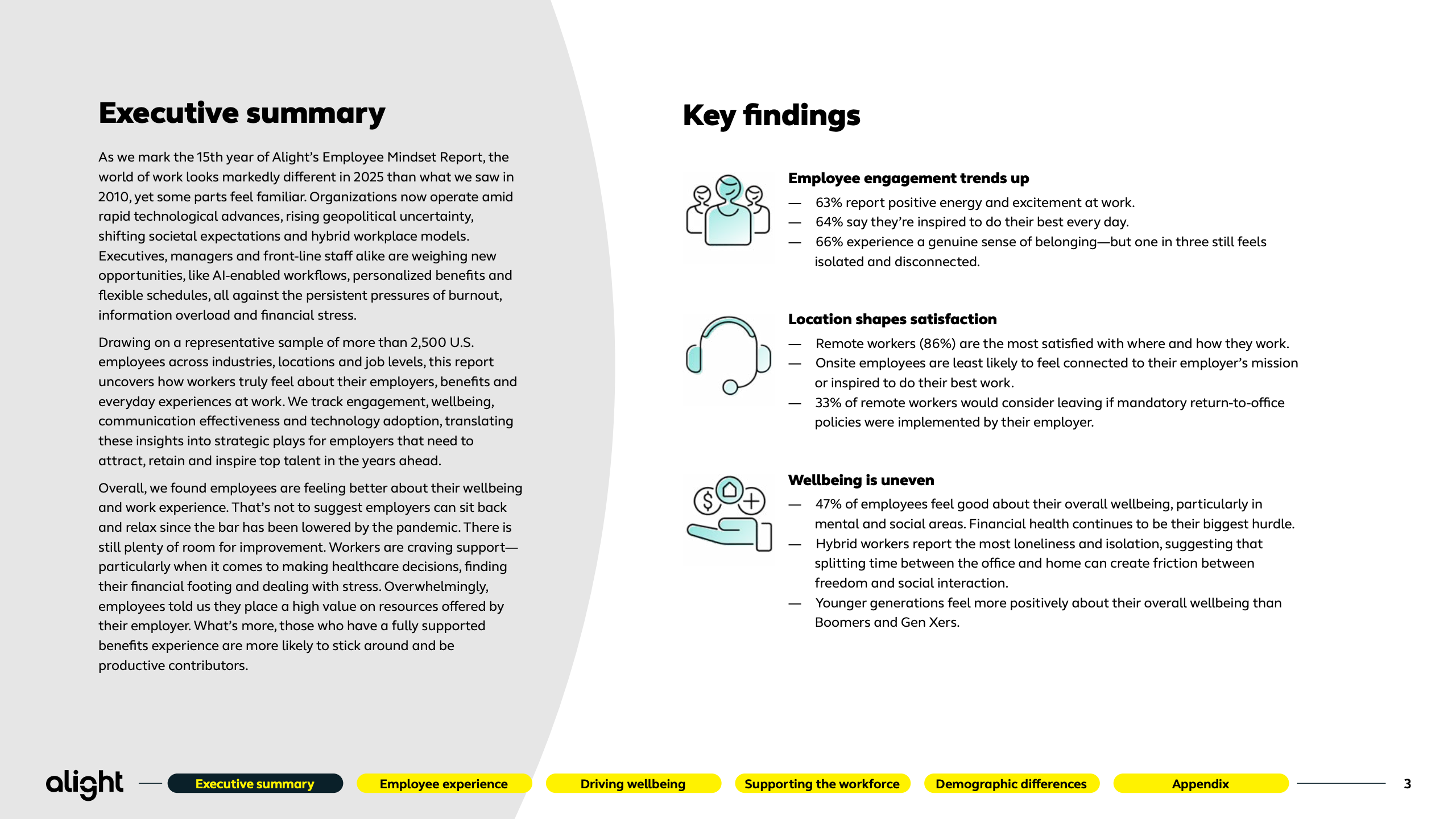 本报告基于Alight对2500名美国员工的系统性调研,覆盖不同年龄、行业与用工形态,刻画出2025年美国劳动力在体验、福祉与技术冲击下的真实心态轮廓。研究显示,员工整体情绪正在修复,但结构性矛盾依然突出。