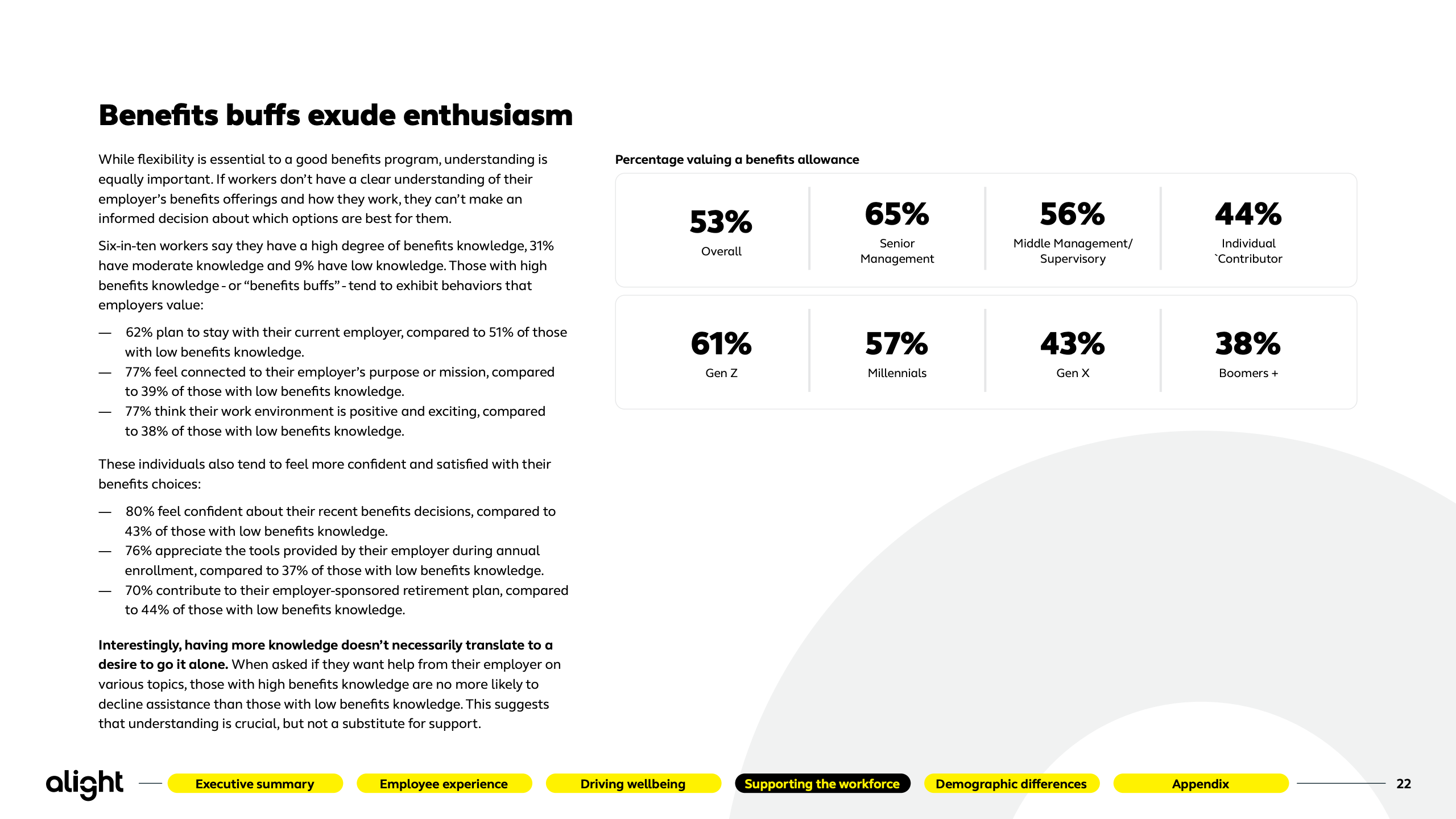福利供给与使用之间的落差持续存在。85%的员工可获得至少一种福祉项目,但单项使用率仅约30%。60%自认“懂福利”的员工,忠诚度高出25%,更可能将福利视为长期投资,说明问题不在供给,而在理解、指引与决策支持不足。