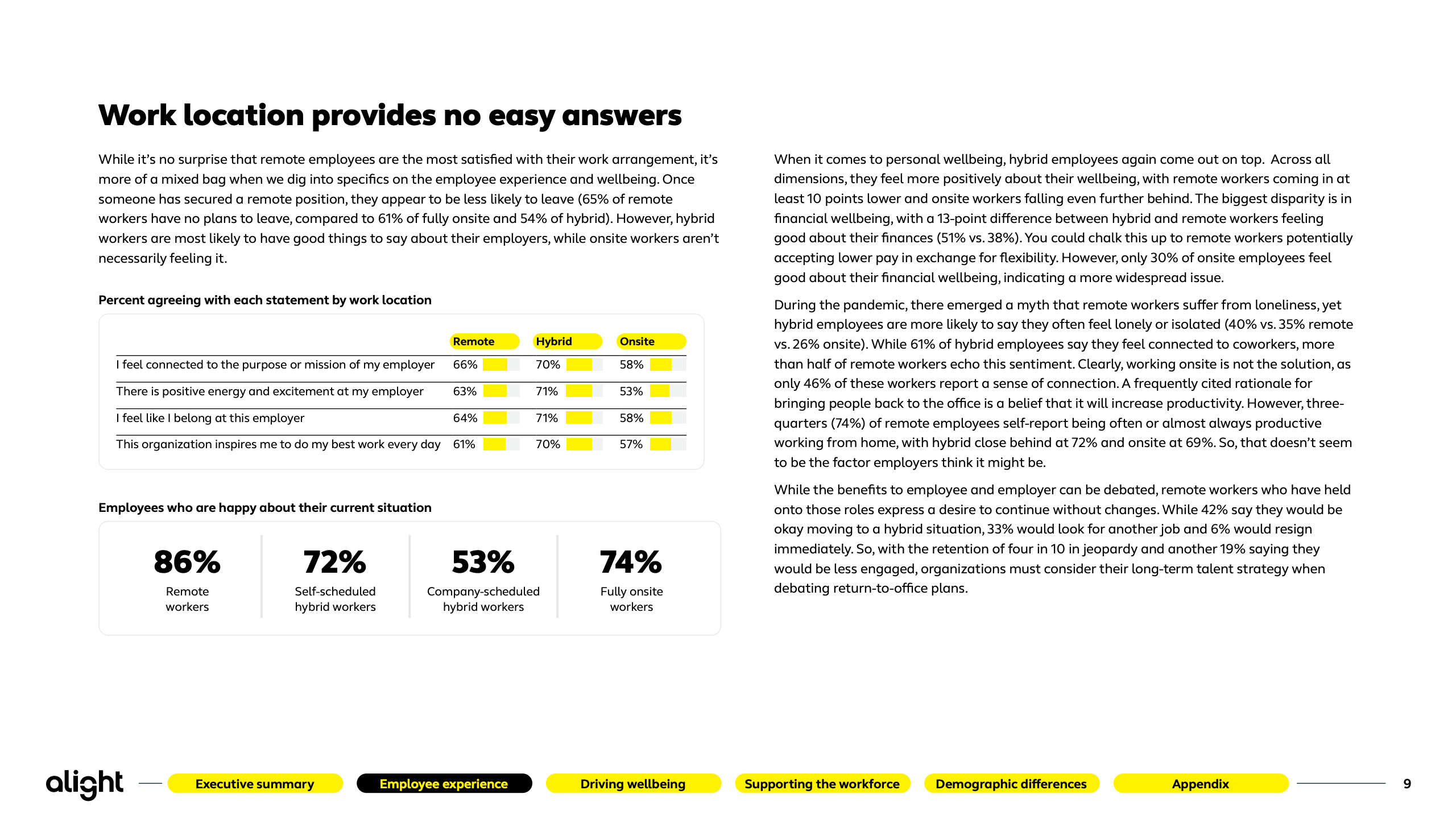 工作模式对满意度的影响呈现非线性结果。远程员工整体满意度最高,86%认可当前安排,但33%明确表示若被强制返岗将考虑离职。混合办公员工在整体福祉感受上领先,但40%更易感到孤独。完全线下员工在使命认同、归属感和激励感上均处低位,表明“回办公室”并非解决效率与凝聚力的万能解法。