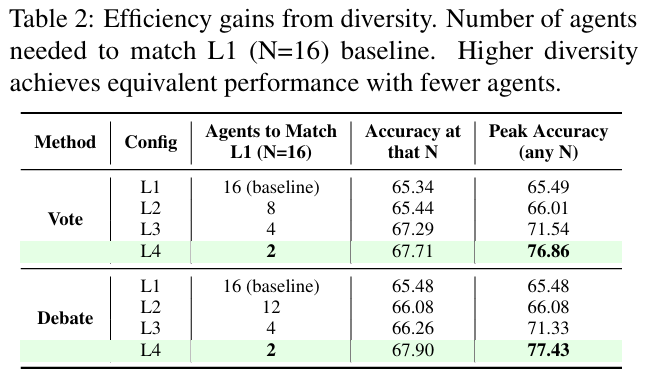 与同质扩展的快速饱和形成鲜明对比的是,多样性配置下的实验结果。论文进一步比较了两类系统:一类由同一模型多次独立运行构成,另一类则由不同 backbone 模型或不同 persona prompt 组成。在匹配计算预算(固定总 agent calls)的前提下,异质系统在同预算下整体更高,并且在更大的 N 上仍能保持增益。