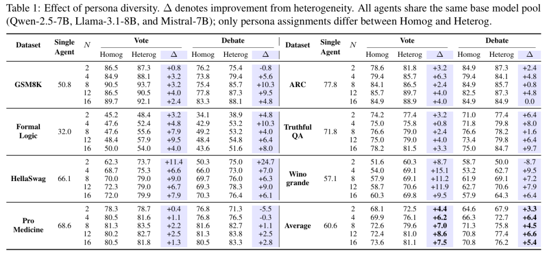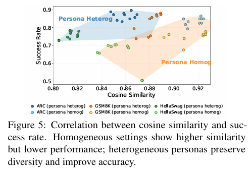 为了更系统地理解这一现象,作者在实验中将多样性拆解为不同来源,包括 persona 多样性、模型多样性,以及二者结合的完全多样性,并在统一设置下进行对比。