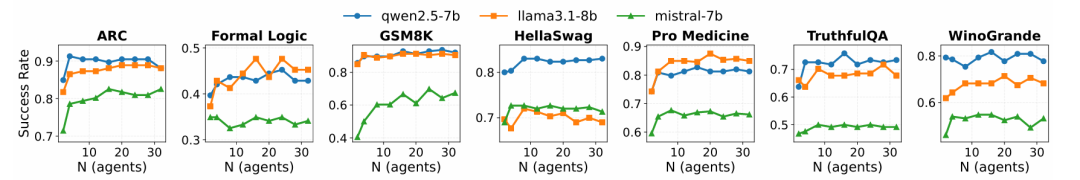 仅改变 agent 数 N,在 7 个基准任务(GSM8K、ARC、Formal Logic、TruthfulQA、HellaSwag、WinoGrande、Pro Medicine)上评估。