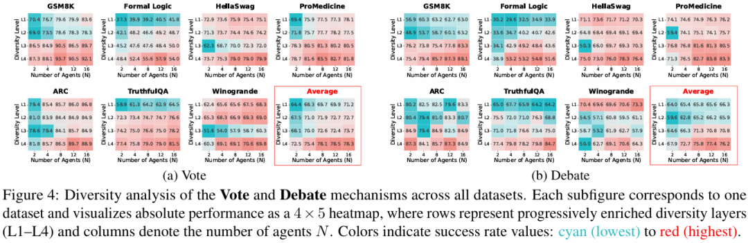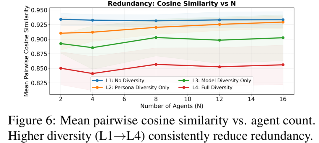 在同质配置下,即便新增智能体,往往也只是在相似推理路径下重复采样,因而对降低不确定性帮助有限;