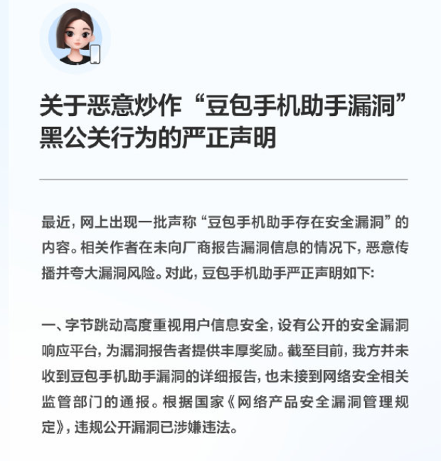 声明指出,字节跳动高度重视用户信息安全,设有公开的安全漏洞响应平台并提供丰厚奖励。截至目前,公司并未收到豆包手机助手漏洞的详细报告,也未接到网络安全相关监管部门的通报。