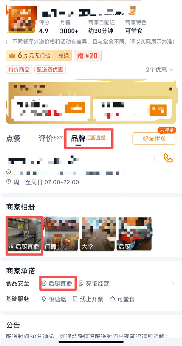 1.在店铺首页寻找“明厨亮灶”“后厨直播”等相关图标。