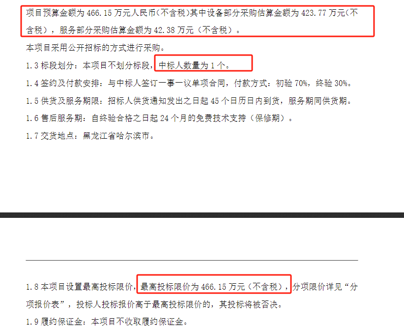 有意思的是,招标公告显示,该项目的预算金额及最高限价均为466.15万元(不含税),中标人数量为1个。