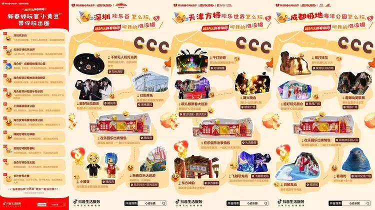 春节作为年度消费与出行的核心旺季,文旅消费持续升温,乐园场景凭借强沉浸、高互动的特质,成为亲子群体新春出游的首选。在此背景下,抖音生活服务启动【超好玩新春指南】项目活动,携手平台原生热度IP抖音黄豆表情,融合明星NPC互动、线下人气巡游、主题快闪等多元形式,打造覆盖线上线下的新春玩乐盛宴。此次活动不仅让乐园×IP的特色玩法成功破圈,更以IP联动为突破口,为合作乐园实现声量与交易的双重提升,也为行业提供了春节档乐园营销可复制的路径。