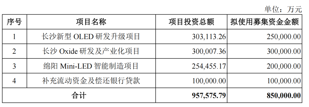 本次IPO,惠科股份拟募集资金85亿元,扣除发行费用后将全部投向核心技术与产能升级。具体来看,25亿元用于长沙新型OLED研发升级项目,30亿元投向长沙Oxide研发及产业化,20亿元用于绵阳MiniLED智能制造项目,剩余10亿元补充流动资金及偿还银行贷款。