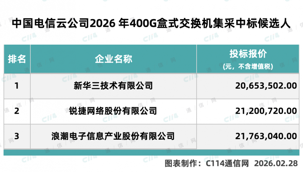 C114讯 2月28日消息(水易)来自中国电信阳光采购网消息,中国电信云公司2026年400G盒式交换机集中采购项目已完成评审。根据评审结果,新华三、锐捷网络、浪潮信息入围。
