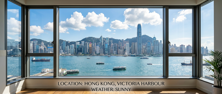 ▲提示词仅需修改前面部分:location: Hong Kong, specific_view: Vitoria Harbour, Weather: Sunny, aspect_ratio: 21:9.