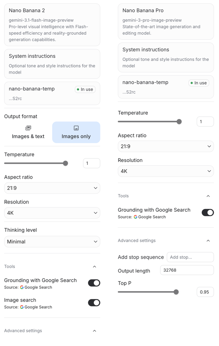 其实在这个提示词里面,有一个「Image search」的选项,这个功能目前是只有 Nano Banana 2 才能启用,如果是初代的 Pro 版本,只有 Google Search 这一个工具。