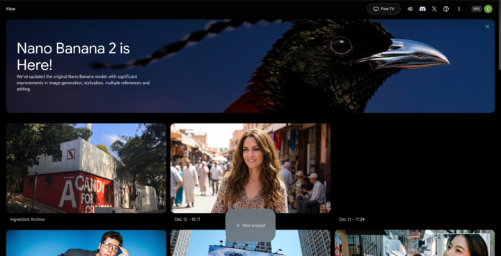同时,在 Flow 内置 Nano Banana 这一高保真图像模型,支持直接生图并作为视频生成的关键帧素材。我们在 Flow 平台,也能使用最新的 Nano Banana 2 模型。