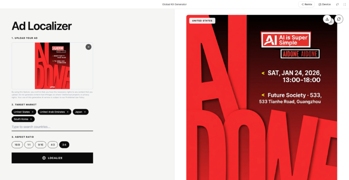 我们输入了一张之前 AIDONE 的活动海报,然后在目标市场里面选择了使用不同语言文字的几个地区,这个 Demo 会直接一次性生成对应市场的海报。