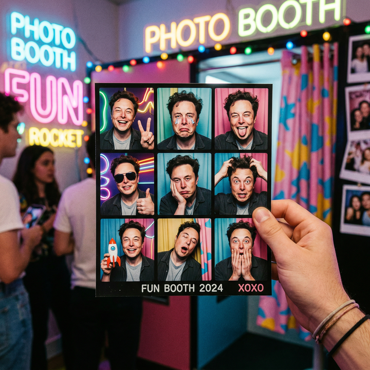 ▲提示词:生成马斯克的九宫格大头贴照片,背景是在拍大头贴的房间内,一只手拿着这张九宫格照片,每个宫格都是不同的动作和表情,有高兴的也有悲伤的,凸显出他的年轻活泼和搞怪爱玩