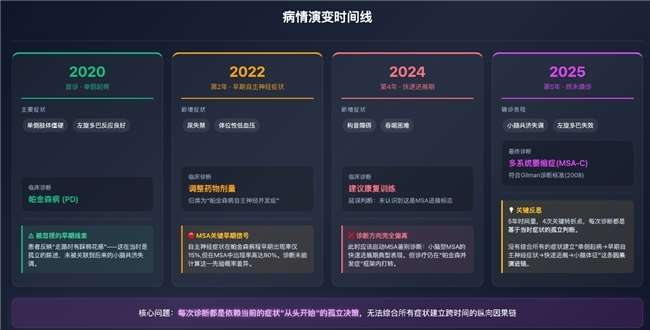 发布会上,宋博士分享了一个真实案例:一位58岁的患者,2020年初诊时因单侧肢体僵硬、对左旋多巴反应良好,被诊断为帕金森病。到了2022年,患者出现尿失禁、体位性低血压等自主神经症状,传统AI系统检索帕金森+自主神经,给出的建议是调整药物剂量。2024年,患者突发构音障碍、吞咽困难,系统检索吞咽困难,建议康复训练。直到今年,患者才被确诊为多系统萎缩症(MSA)——五年的时间,错过了最佳干预窗口。