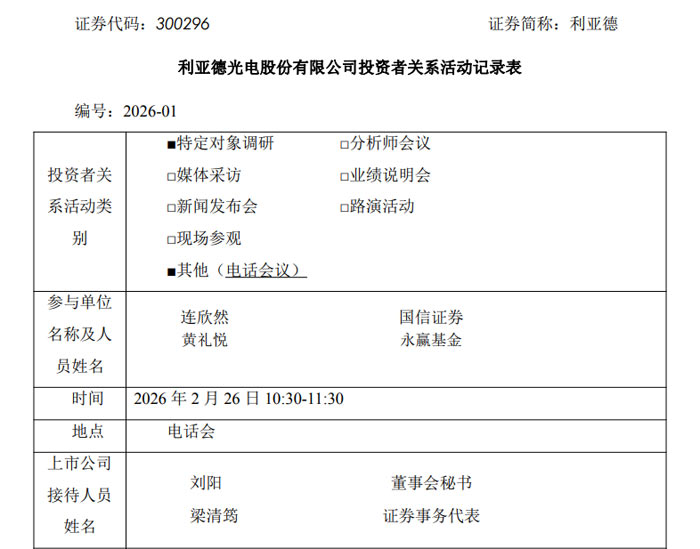 2026 年 2 月 26 日,利亚德光电股份有限公司(证券代码:300296,证券简称:利亚德)以电话会议形式开展投资者关系活动,公司董事会秘书刘阳、证券事务代表梁清筠出席,就 2025 年业绩扭亏为盈、产品提价、行业发展、核心业务布局及创新业务进展等问题与国信证券、永赢基金相关投资者进行深度交流,透露公司 2025 年开启新战略周期后成效显著,多举措实现经营质效双升,主营业务未发生重大不利变化。
