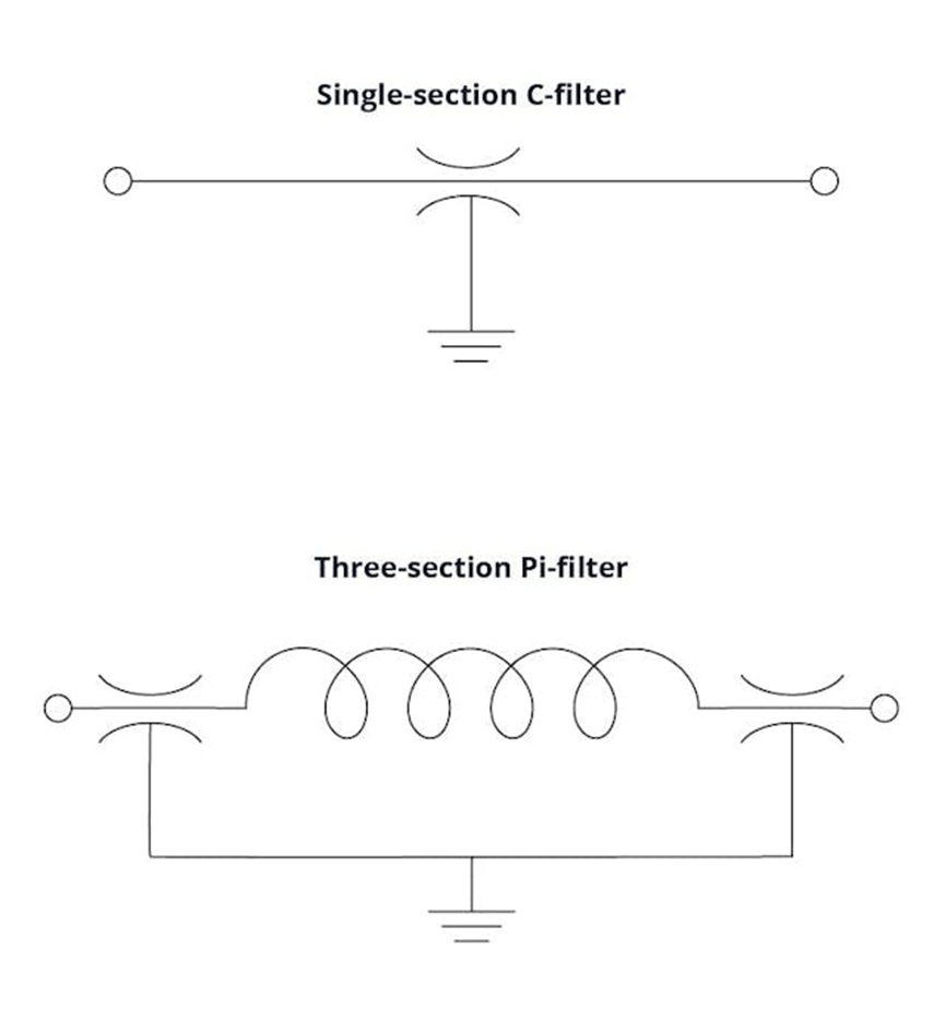 图1 常见的低通滤波器结构包括单节 C 型滤波器(提供通用滤波)和性能更强的三节 π 型滤波器,后者可在更严苛的 EMI 环境下提供更陡峭的衰减曲线。