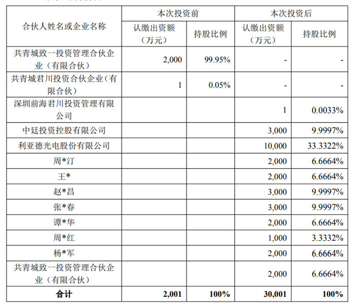 资料显示,道盈盛远成立于 2025 年 10 月 16 日,注册地为江西省九江市共青城市基金小镇内,执行事务合伙人为君川资本,其经营范围包含以私募基金从事股权投资、投资管理等活动,以及创业投资(限投资未上市企业)。君川资本作为基金管理人,已在中国基金业协会登记为私募基金管理人,登记编码 P1032141,主要投资领域涵盖高科技、商业航天、生物医药等,且并非失信被执行人,与利亚德及公司控股股东、实际控制人等无关联关系或利益安排。除君川资本、利亚德外,中廷投资控股有限公司、共青城致一投资管理合伙企业(有限合伙)及多位自然人亦为道盈盛远有限合伙人,各合作方均非失信被执行人,与利亚德无关联关系。