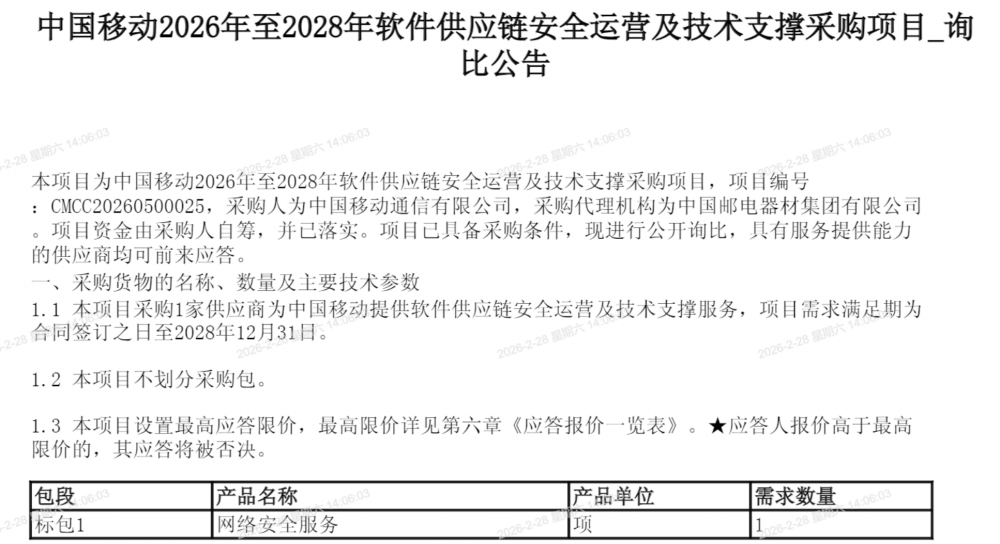 C114讯 2月28日消息(兰茜)中国移动采购与招标网日前发布2026年至2028年软件供应链安全运营及技术支撑采购项目公告。