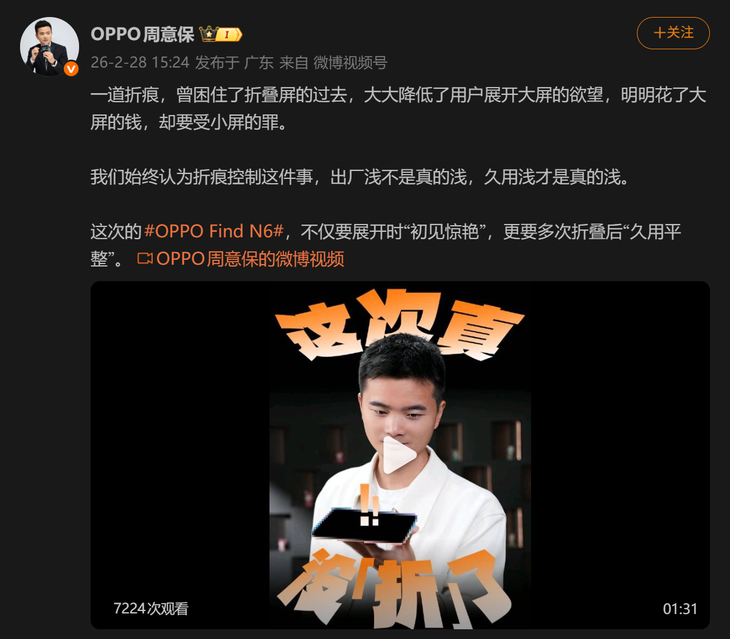 今日,OPPO Find系列产品负责人周意保在微博发视频表示:出厂浅不是真的浅,久用浅才是真的浅。Find N6不仅追求展开 “初见惊艳”,更实现多次折叠后仍 “久用平整”,从根源解决折叠屏长期使用折痕加深的行业痛点。
