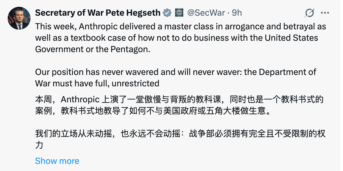 5:35,美国白宫官方账号在社交平台转发上述表达内容的截图。6:14,美国战争部部长皮特·黑格塞斯(Pete Hegseth)发文称,战争部必须完全、不受限制地访问Anthropic大模型,以实现所有合法防御目的。但Anthropic试图将硅谷意识形态置于美国人民生命安全之上。