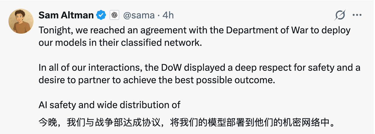 北京时间2月28日,OpenAI CEO 山姆·奥尔特曼(Sam Altman)发文称:OpenAI与美国战争部(“Department of War”,该称呼源自特朗普时代的一项行政命令)达成协议,将模型部署到他们的机密网络中。