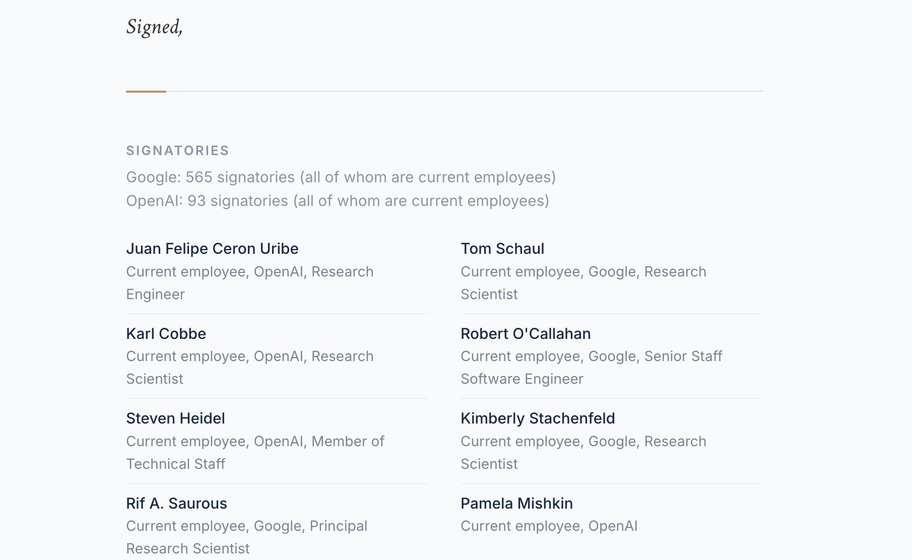 在OpenAI截胡与美国战争部合作协议之前,包括565名Google员工、93名OpenAI员工共同签署了公开信《We Will Not Be Divided》(我们不会被分裂)。据公开信描述,五角大楼正与Google及OpenAI谈判,试图促使他们同意Anthropic此前拒绝的条件,签署该公开信旨在促进公司之间共同理解与团结。