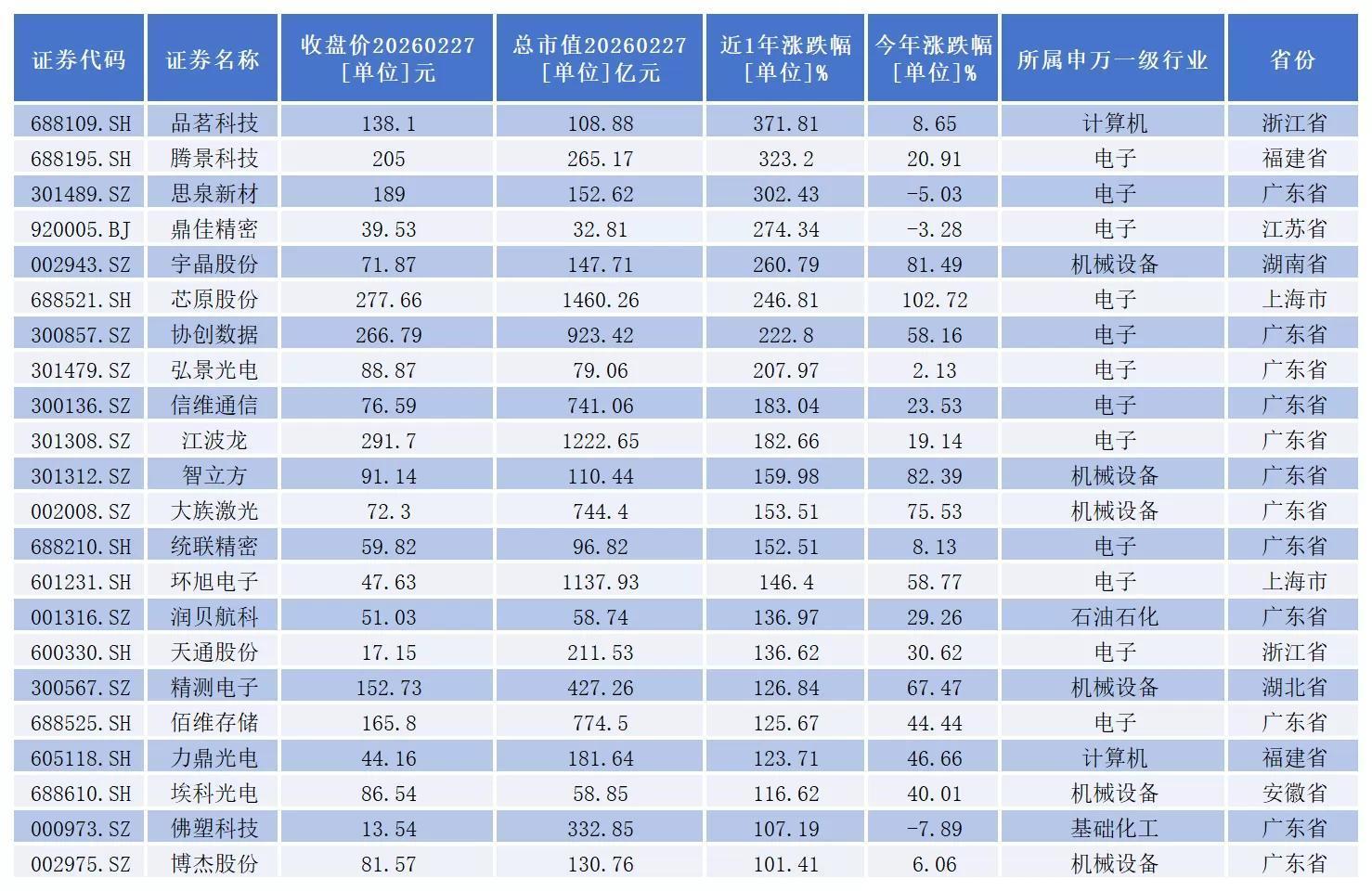 品茗科技(688109.SH)、腾景科技(688195.SH)、思泉新材(301489.SZ)、鼎佳精密(920005.BJ)、宇晶股份(002943.SZ)、芯原股份(688521.SH)、协创数据(300857.SZ)、弘景光电(301479.SZ)等8家上市公司近一年股价累计涨幅超200%。