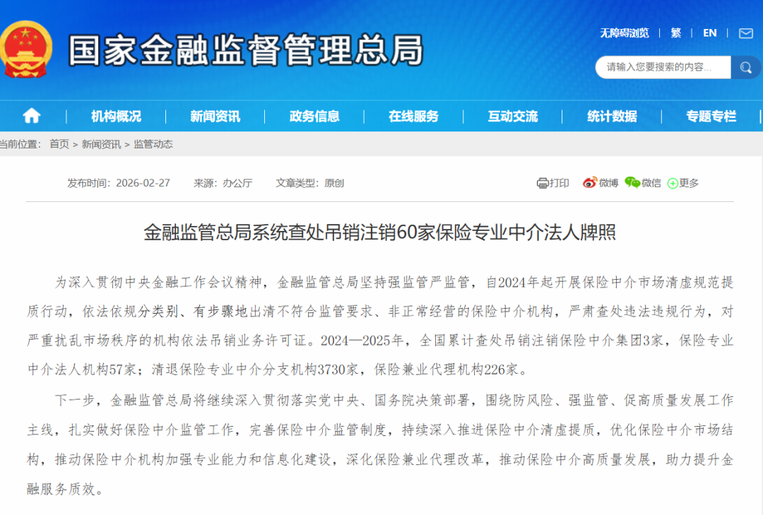 为深入贯彻中央金融工作会议精神,金融监管总局坚持强监管严监管,自2024年起开展保险中介市场清虚规范提质行动,依法依规分类别、有步骤地出清不符合监管要求、非正常经营的保险中介机构,严肃查处违法违规行为,对严重扰乱市场秩序的机构依法吊销业务许可证。2024—2025年,全国累计查处吊销注销保险中介集团3家,保险专业中介法人机构57家;清退保险专业中介分支机构3730家,保险兼业代理机构226家。