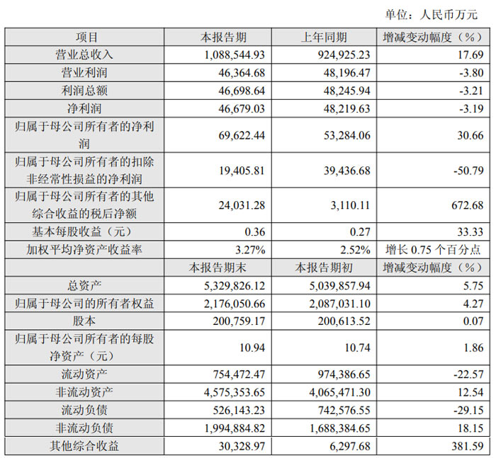 归属于母公司所有者的净利润为 6.96 亿元,较上年同期的 5.33 亿元增长 30.66%;归属于母公司所有者的扣除非经常性损益的净利润为 1.94 亿元,较上年同期的 3.94 亿元大幅下降 50.79%。基本每股收益 0.36 元,较上年同期的 0.27 元增长 33.33%;加权平均净资产收益率 3.27%,较上年同期提升 0.75 个百分点。归属于母公司所有者的其他综合收益的税后净额 2.40 亿元,较上年同期的 0.31 亿元增长 672.68%。