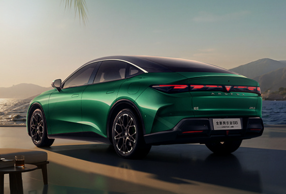 侧面配备无边框车门与隐藏式门把手,19英寸轮毂搭配荧光绿刹车卡钳,尾部则搭载贯穿式多维超红光尾灯、可发光品牌标识及大尺寸智能主动升降尾翼。
