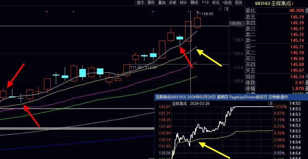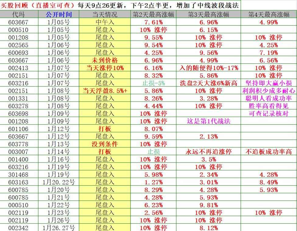 举例上面截图红色箭头88元补仓买过的 603163 圣晖集成,回头看涨幅60%+,买入的时候** 中线 的,合适按照10日线不跌破持有,上面红色箭头旁边那个黄色箭头,指的那条就是10日线,收盘不跌破不算顶部,跌破次日反包不算顶部,第2个条件就是早上大阴线跌停,跌停超过2分钟不打开的算顶部。而且这个股开年后第一天就是大跌低吸收盘浮盈,次日涨停10%,恭喜大家收获红包,如何避免卖掉后大涨和涨停后悔?教你方法,看上面截图分时走势的黄色线,也是多空分界线,就是截图最下面那个黄色箭头指的那条线《跌破后V起来的V最低点不跌破的,不算有效跌破》或是担心大涨后跌的,可以大涨5%左右自觉出掉一半,这样有利润垫底,另外一半仓位自然有信心和心态好敢持有看分时黄色线了,运气好吃涨停和连续涨停是正常的,短线1月底至今我们就吃过次日涨停的有好几个,看上面战绩统计图。