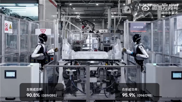据介绍,小米机器人在压铸车间自攻螺母上件工站中连续自主运行3小时,双侧同时安装成功率为90.2%,同时满足了最快76秒的产线生产节拍要求。