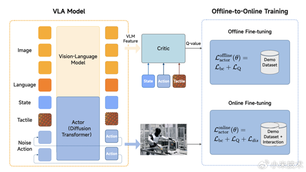 在VLA大模型Xiaomi-Robotics-0的基础上,结合强化学习技术,使机器人能够快速适配不同下游工况,并持续从真实物理环境的交互经验中学习,保障其在复杂工况下实现长时间、稳定、高可靠的作业表现。