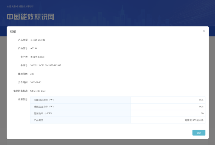 而在一月份,我们的确在中国能效标识网上看到了「美国苹果公司高性能 LCD 显示器」: