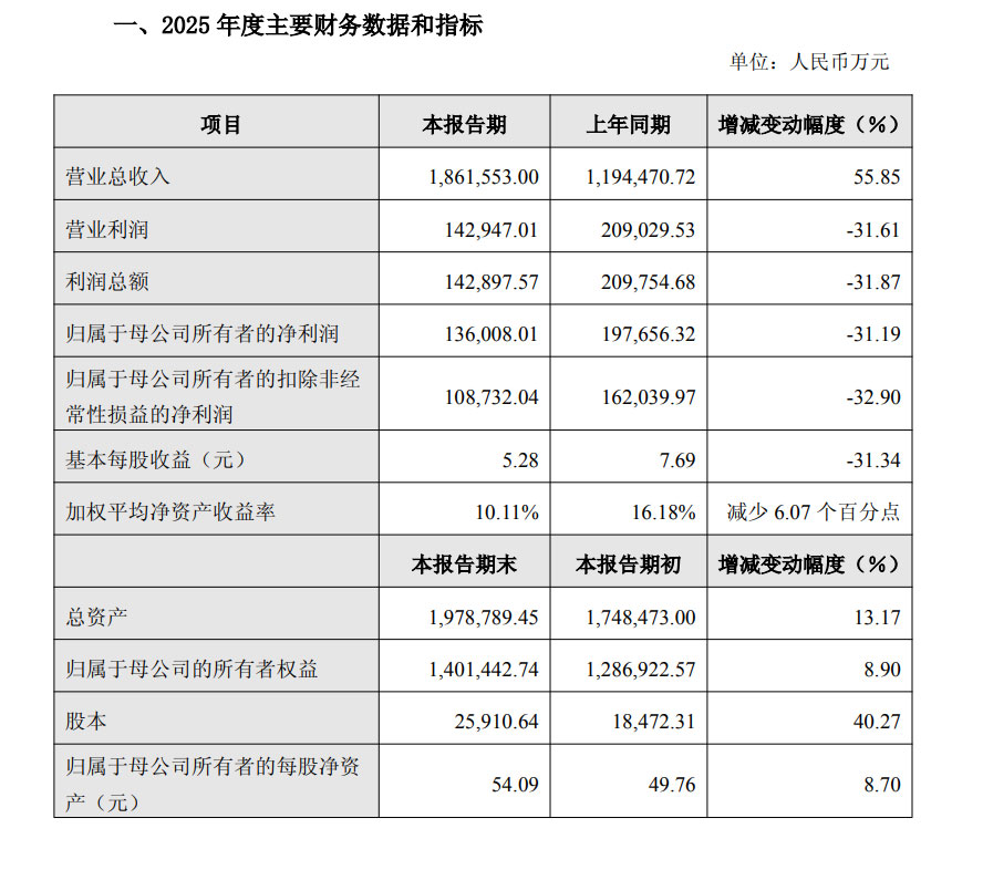 数据显示,公司全年实现营业总收入186.16亿元,同比大幅增长55.85%,展现出强劲的营收增长势头;但与之形成鲜明对比的是,归母净利润仅为13.60亿元,同比下滑31.19%,扣非净利润10.87亿元,降幅进一步扩大至32.90%,利润端的承压态势显著。