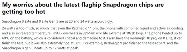 回顾此前几代产品,骁龙8E的热功耗为20W,而骁龙8E5则攀升到了24W。这一数值已经达到了部分轻薄笔记本处理器的功耗水平,对于体积小巧的智能手机而言,发热问题将成为性能释放的最大瓶颈。